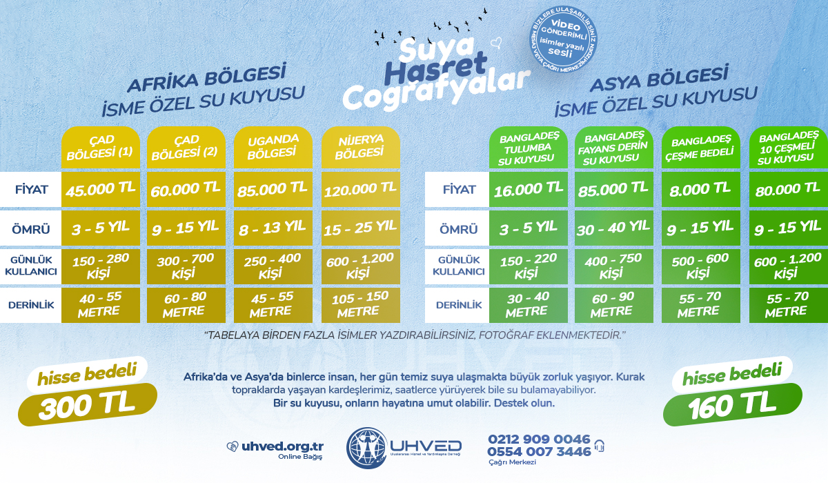 Su, hayatın kaynağıdır. Uhved Derneği olarak Afrika’da hisseli ve tam su kuyusu, Asya’da hisseli, tam ve 10 çeşmeli su kuyusu projeleriyle milyonlarca insana umut oluyoruz.